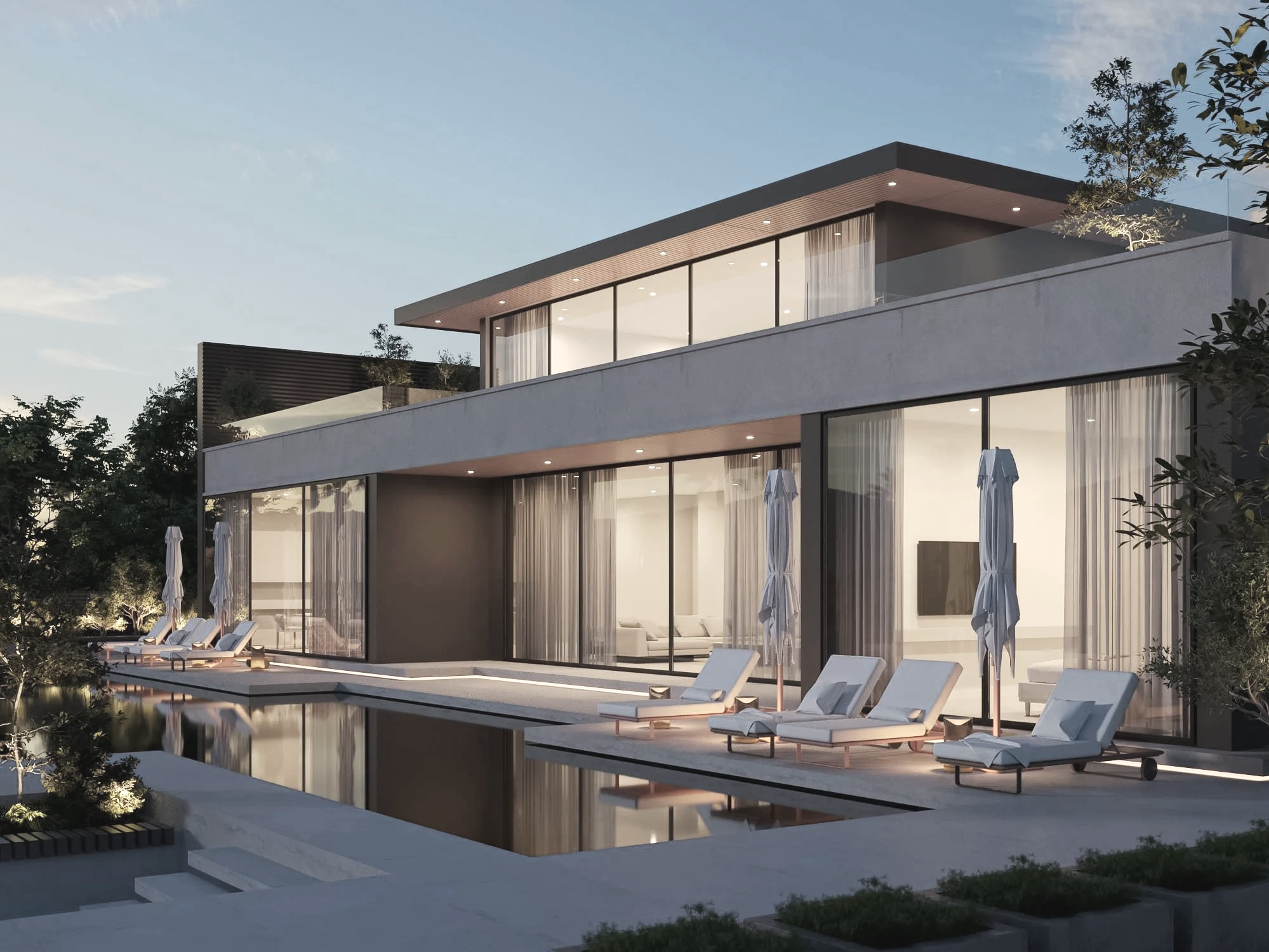 Die Villa Reusch artikuliert sich über klare, reduzierte Volumen und einen offenen, fließenden Grundriss. Eine vollständig verglaste Fassade definiert Transparenz und Lichtführung, öffnet die Räume zur Landschaft und erzeugt einen subtilen Dialog zwischen Innen und Außen.